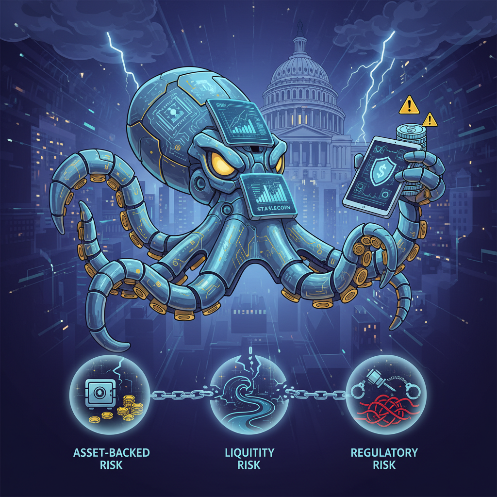 Stablecoin thường liên kết với các loại tiền tệ hợp pháp hoặc tài sản khác nhằm cố gắng duy trì sự ổn định giá. Tuy nhiên, sự ổn định này tiềm ẩn rủi ro liên quan đến tính xác thực và thanh khoản của tài sản hỗ trợ cũng như độ tín nhiệm của tổ chức phát hành. Khi stablecoin không thể được đổi hoặc giá trị bị tách rời đột ngột, có khả năng gây ra hoảng loạn trên thị trường một cách nhanh chóng.